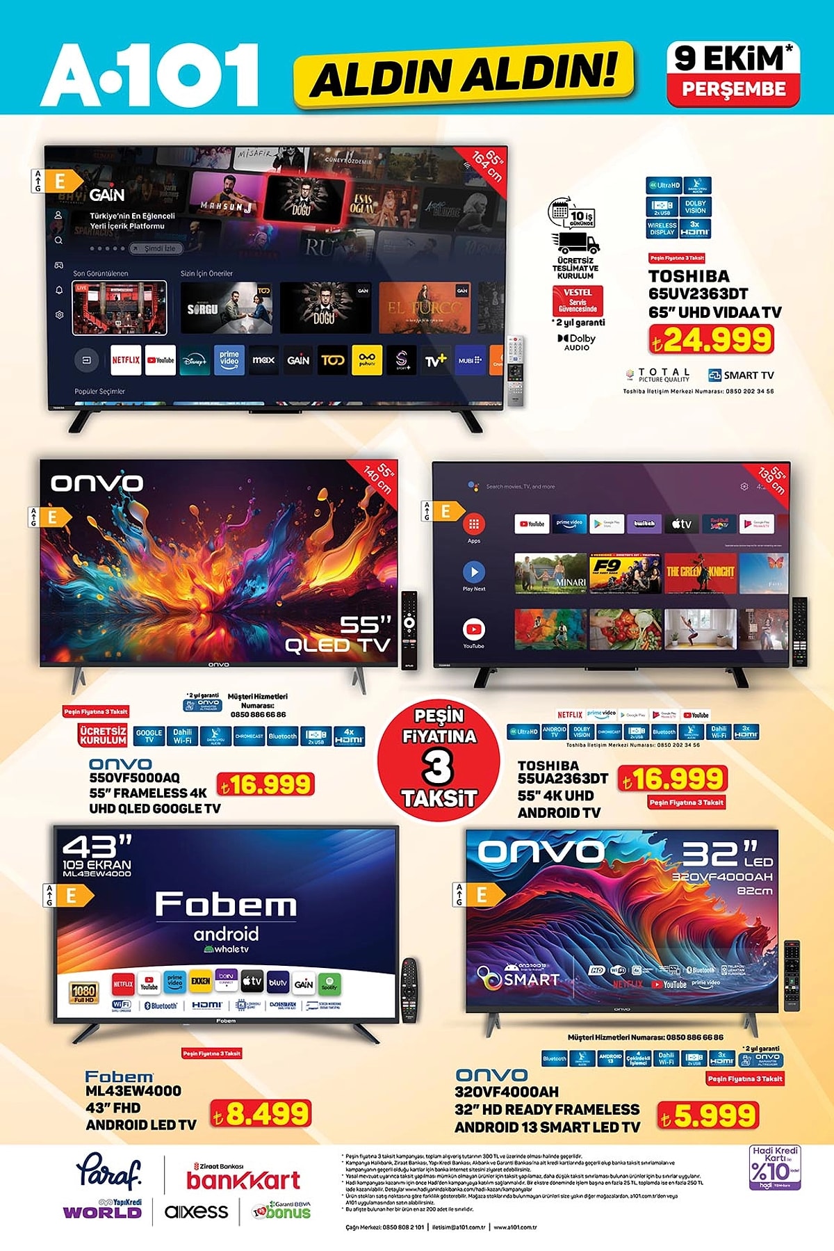 9 Ekim 2025 A101 Aldın Aldın kataloğu açıklandı. Özellikle televizyon kategorisinde öne çıkan fırsatlar teknoloji tutkunlarını bekliyor.
