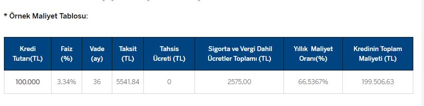 100.000 TL kredi için 36 ay vadede aylık taksit tutarı 5.541,84 TL. Toplam maliyet 199.506,63 TL.