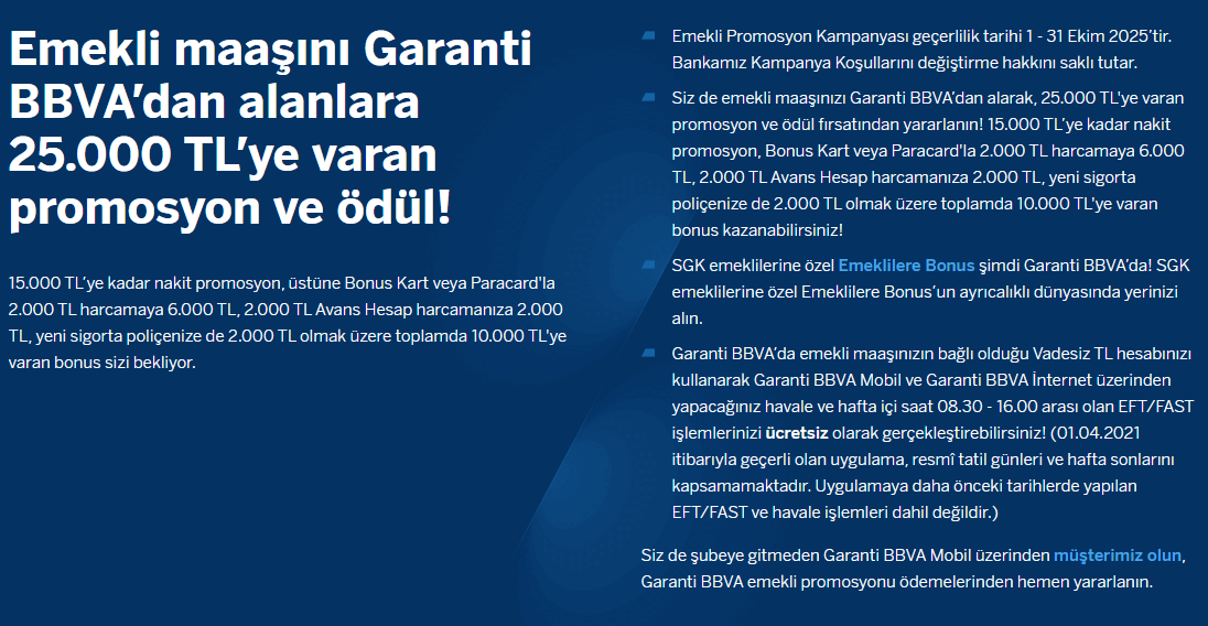Garanti BBVA Emekli Promosyon Kampanyası 1 – 31 Ekim 2025 tarihleri arasında geçerlidir.