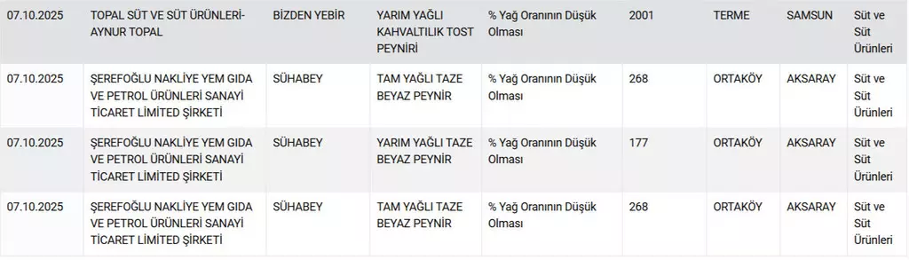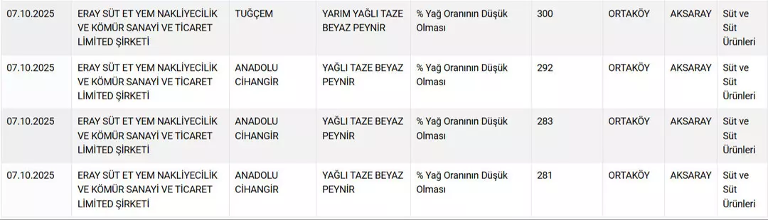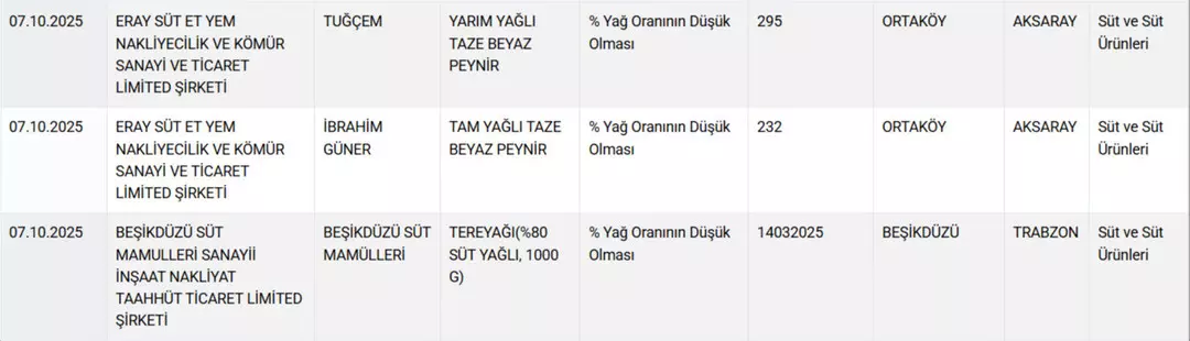 7 Ekim 2025’te güncellenen son listede, özellikle süt ürünlerinde ciddi uygunsuzluklar tespit edildi. Listede 12 peynir, 1 tereyağı ve 1 yoğurt markası yer aldı. Denetim sonuçları, paketlerde yazan bilgilerle ürünlerin gerçek içeriklerinin çoğu zaman uyuşmadığını ortaya koyuyor.
